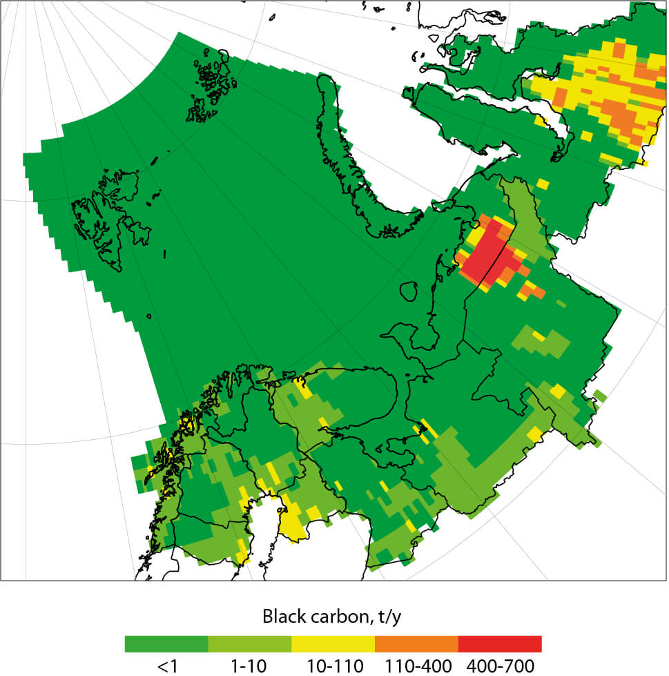 Figure 4.11 Black carbon emissions in the Barents area (excluding wildfires). Graphic based on the global emission dataset (IIASA-GAINS, ECLIPSE v5) used in the most recent AMAP assessment on black carbon and tropospheric ozone (AMAP 2015a,b) and the ECLIPSE project (Stohl et al., 2015; Klimont et al., 2017).