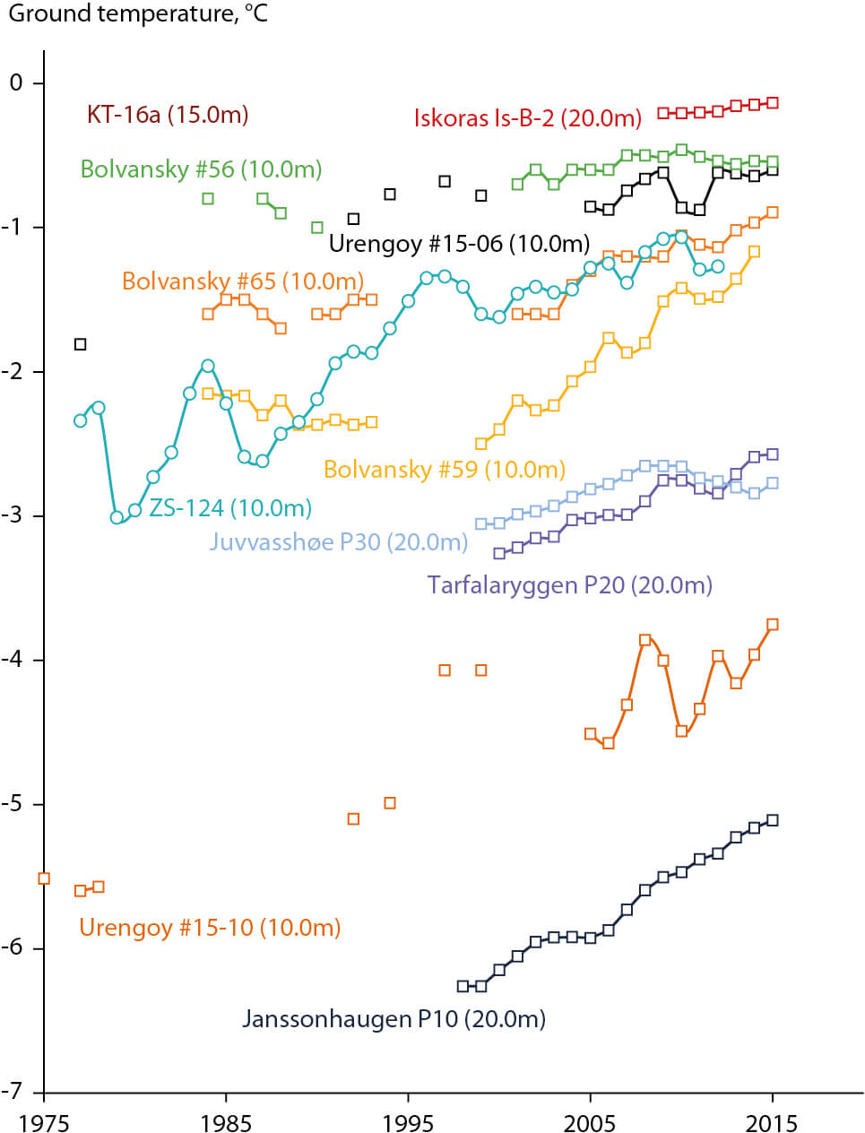 Figure 4.15 Time series of ground temperature at depths of 10 to 20 m below the surface at selected measurement sites that fall roughly within the continuous to discontinuous and warm permafrost zones in the Barents area, including Scandinavia, Svalbard, and Russia. Data updated from Christiansen et al. (2010) and Romanovsky et al. (2014, 2015).