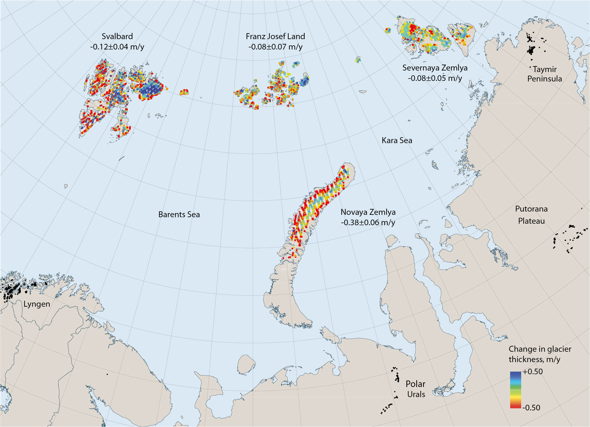 Figure 4.16 Distribution and recent change in thickness for glaciers in the Barents-Kara Sea region. Colors indicate rate of change in thickness based on ICESat laser altimetry for the period 2003–2009. Glaciers on the Eurasian continent are shown in black, with exaggerated extent for better visibility.