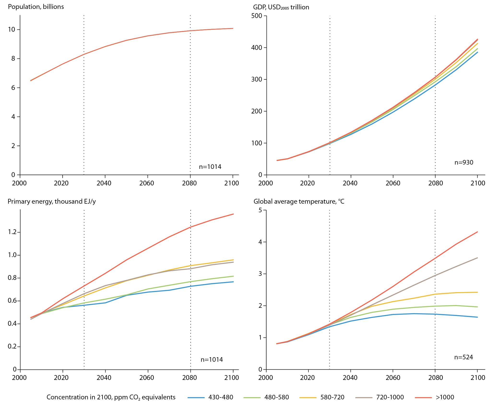 Figure 4.17 Key global drivers in the ~1200 scenarios assessed during the latest IPCC assessment. To enhance clarity, only the median is shown within each scenario category. The dotted lines at 2030 and 2080 are to help highlight the increase in uncertainty with time horizon. The number of scenarios used to generate each plot is shown at the bottom right. Based on the IPCC scenario database (Krey et al., 2014).