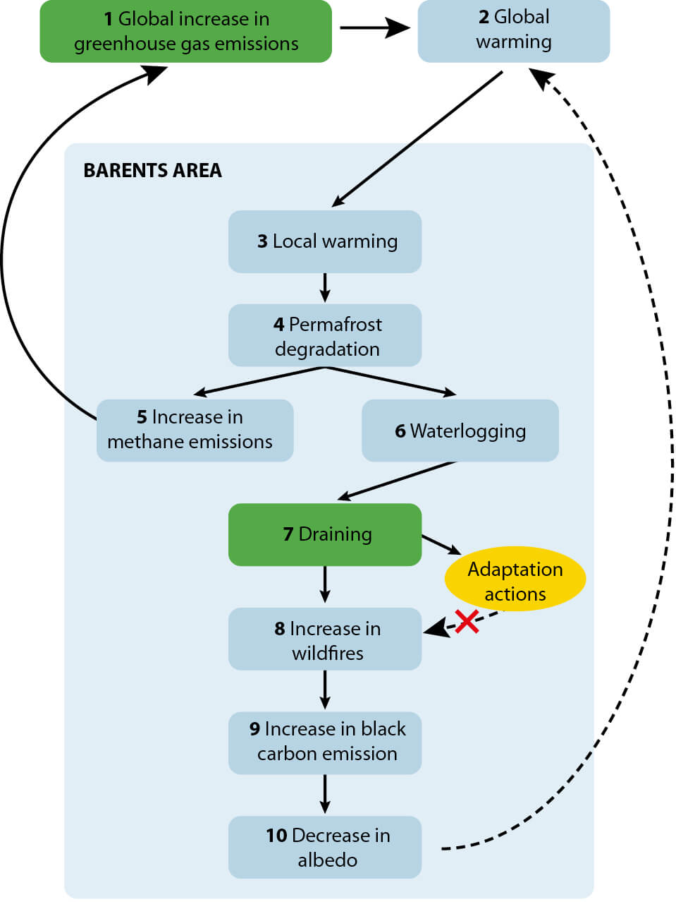 Figure 4.18 Example of positive feedbacks in the ‘environment-socio-economic’ system with possible intervention via adaptation actions. Human actions (green and yellow boxes), environmental responses (blue boxes).