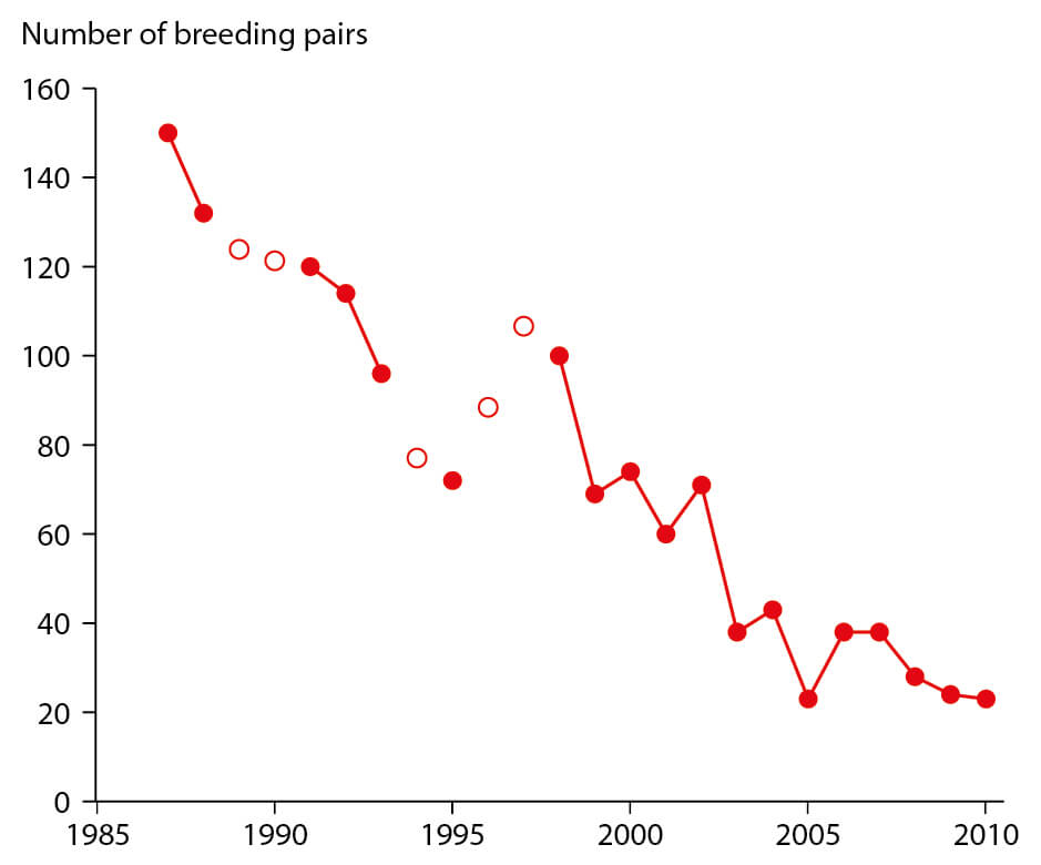 Figure 6.4. Nests occupied by glaucous gull at Bjørnøya between 1987 and 2010 at a study plot. No monitoring was undertaken in 1989, 1990, 1994, 1996 and 1997. Open symbols indicate explorations based on the PROC EXPAND procedure which is a tool to work with time series. Erikstad et al. (2013).