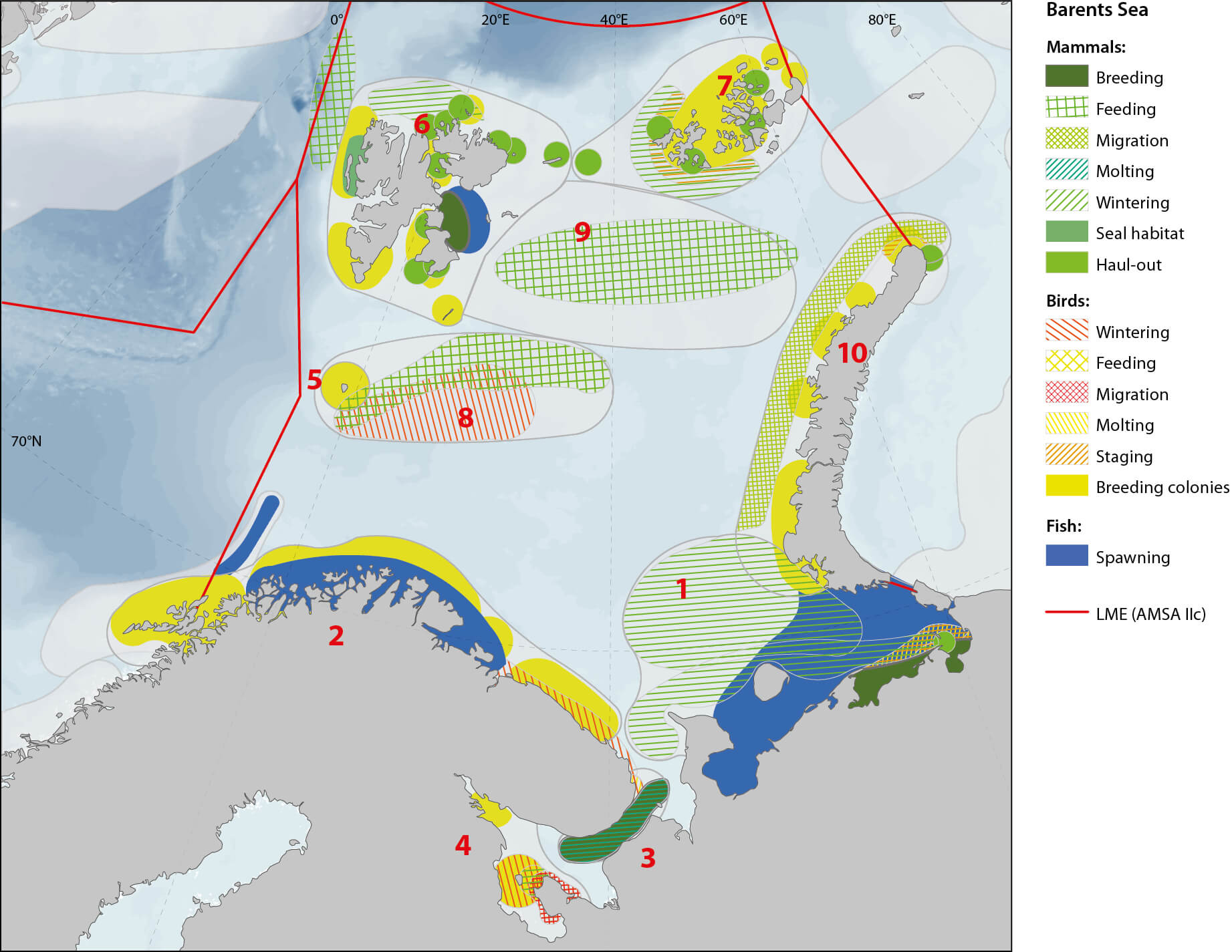 Figure 6.8 Ten areas of heightened ecological significance in the Barents Sea LME (AMAP/CAFF/SDWG, 2013).