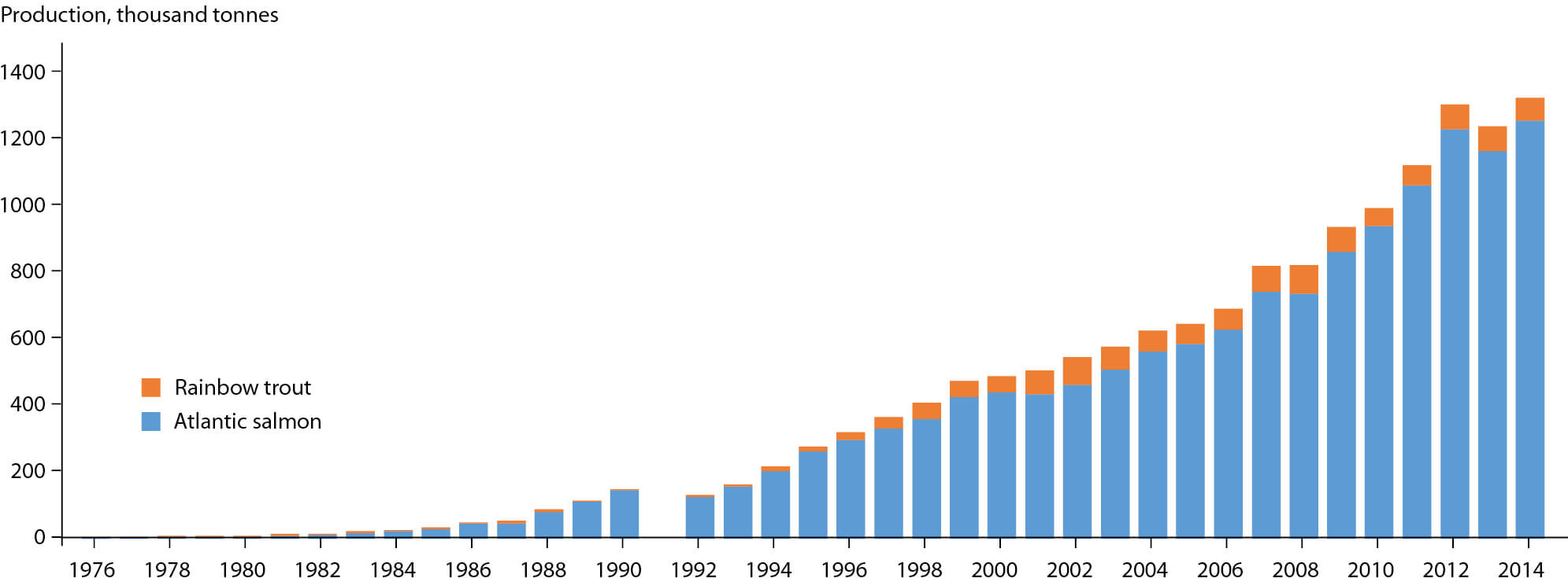 Figure 6.11 Production of farmed salmonids in Norway (Statistics Norway).