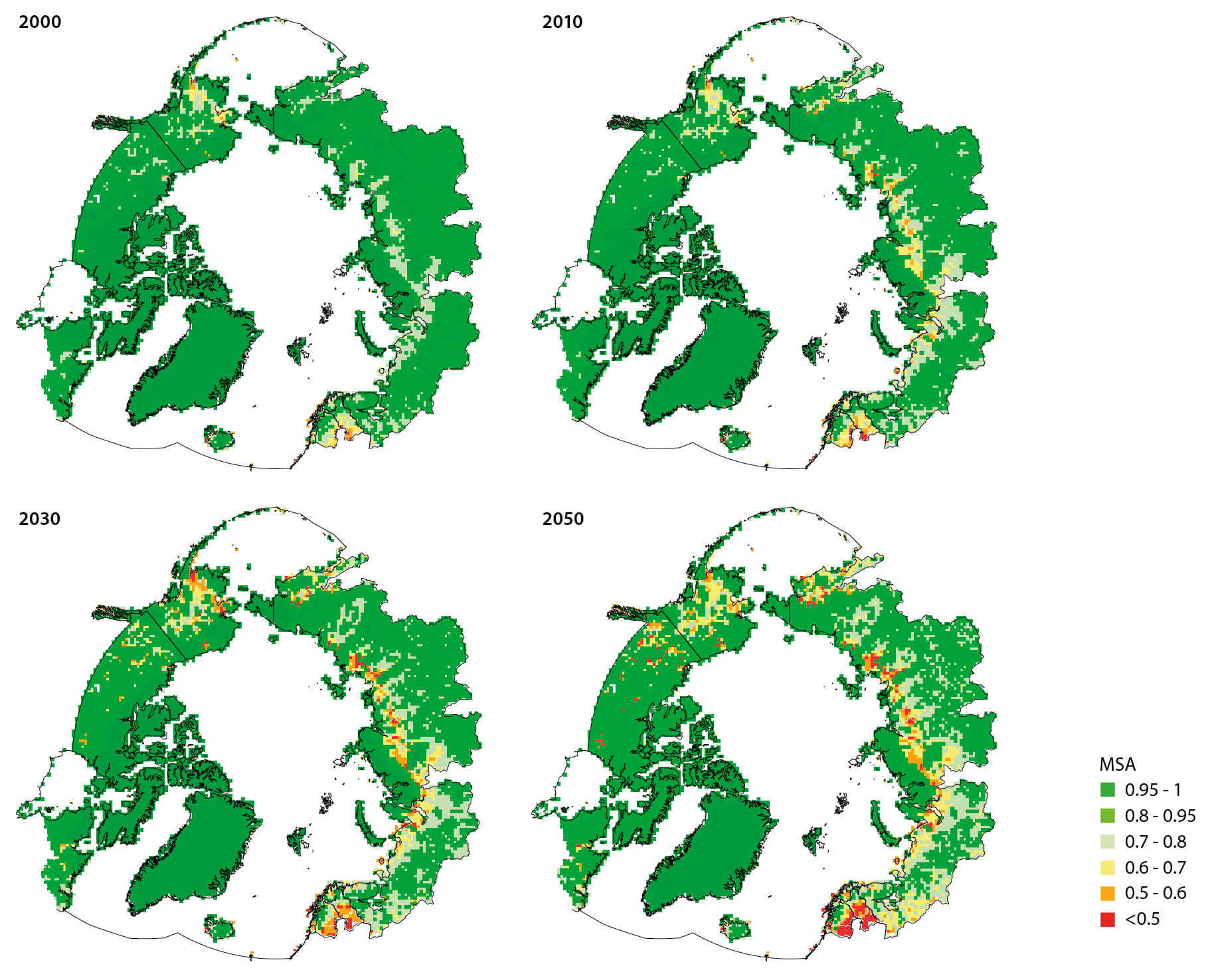 Figure 7.4 Trend in mean species abundance (MSA) in the Arctic for the baseline scenario of the Rethinking Study (based on data from the Netherlands Environmental Assessment Agency, 2010).