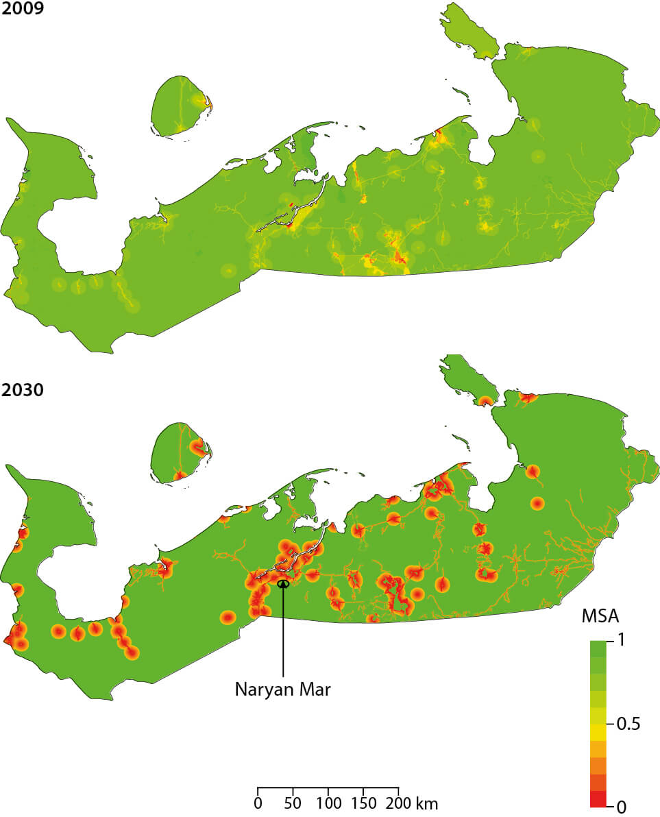 Figure 7.8 Mean species abundance (MSA) across the Nenets AO in 2009 (upper). Local disturbance is centered around the city of Naryan Mar, and the surrounding extensive oil fields to the north and south. The lower plot shows MSA across the Nenets AO for the future infrastructure scenario. (Wilbert van Rooij / Plansup).