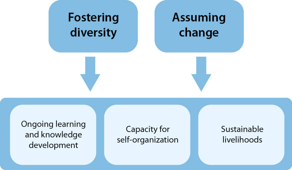 Figure 8.3 Five key ‘ingredients’ of social-ecological resilience. The two in the upper tier are cross-cutting and contribute resilience to each of those in the lower tier.