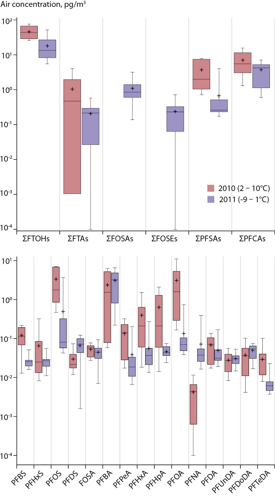 Figure 2.6 Box and whisker plots of PFAS concentrations for PFAS groups and ΣPFSAs (upper) and individual PFSAs and PFCAs in air (sum of particle and gas phases) (lower). Boxes correspond to the interquartile range (25th and 75th percentiles), whiskers to the 5th and 95th percentiles. 2010 FOSAs and FOSEs are excluded owing to contamination in 2010 by MeFOSA and MeFOSEs.