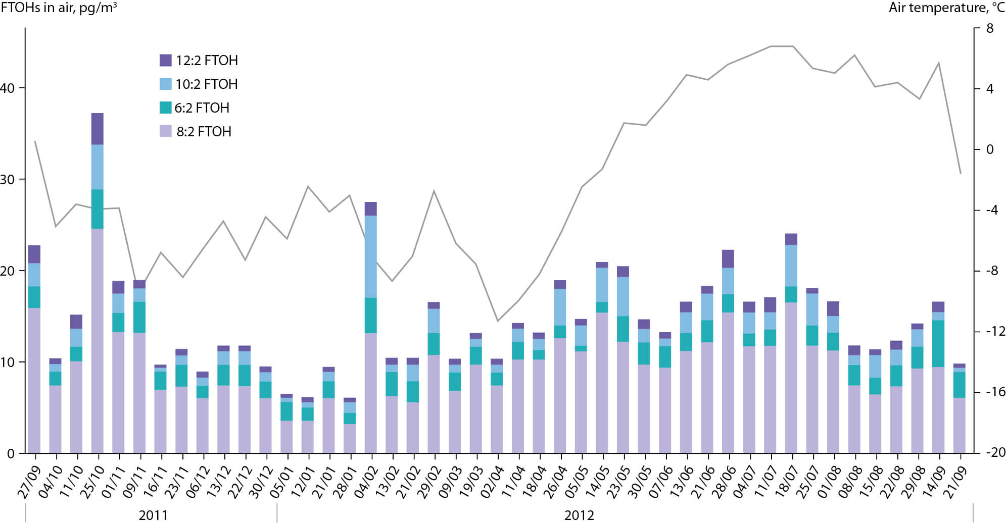 Figure 2.8 FTOHs measured in air at Ny-Ålesund (Svalbard) between September 2011 and September 2012 (Xie et al., 2015). The grey line shows average temperatures during the air sampling.