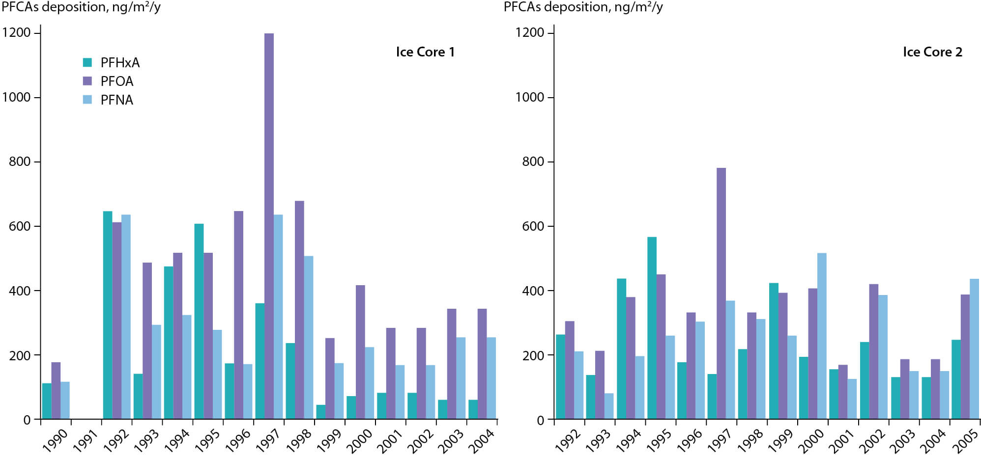 Figure 2.9 Estimated annual fluxes of PFCAs (PFHxA, PFOA, and PFNA) in ice cores from Svalbard, Norway (Kwok et al., 2013). [Note the original graph published by Kwok et al. showed fg/(m2 ∙ yr) flux units whereas the correct units are shown here.]