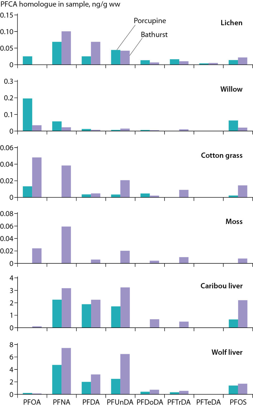 Figure 2.10 PFCA homologue composition of vegetation, caribou and wolf in the Porcupine (Yukon) and Bathurst (Nunavut) caribou summer grazing areas (Müller et al., 2011).