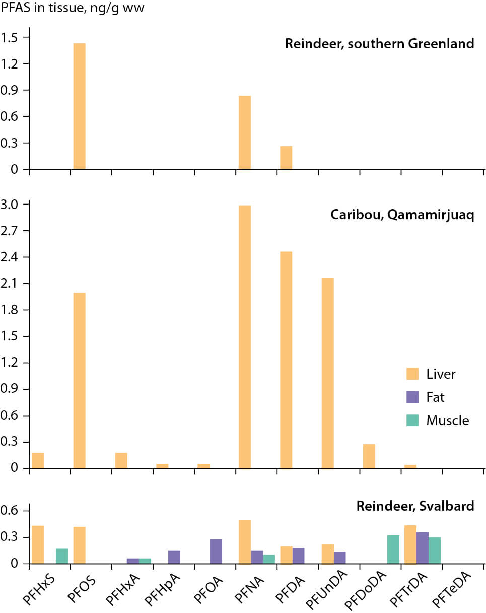 Figure 2.11 Comparison of PFAS profiles in caribou liver from the Qamamirjuaq herd (near Arviat, Canada) (Gamberg and Muir, unpubl. data) and reindeer liver, fat and muscle from Svalbard (Carlsson et al., 2012a). Results from southern Greenland from Bossi et al. (2015).