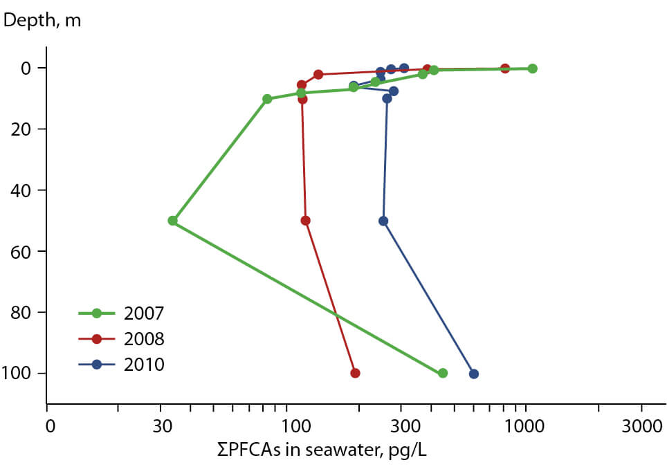Figure 2.17 ΣPFCAs (sum of C6–C10-perfluorocarboxylates) in seawater from Barrow Strait (Resolute, Nunavut). Sample collection was conducted from the ice during late May to early June each year (Muir et al., 2015c).