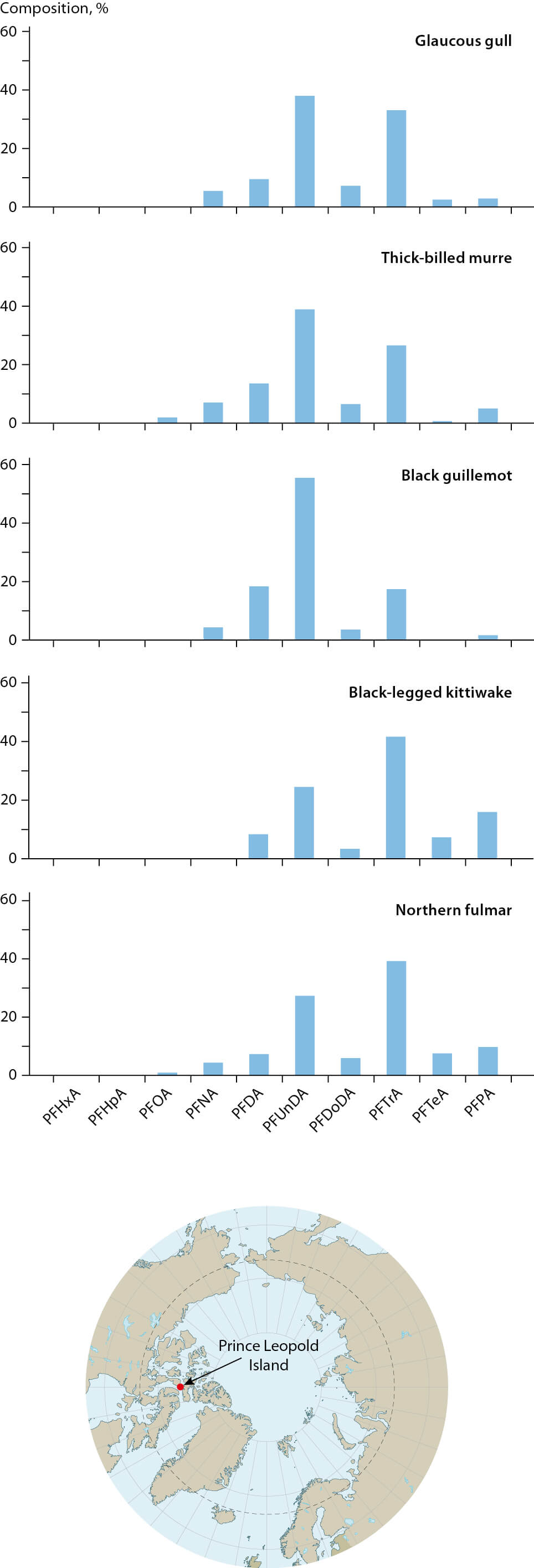 Figure 2.22 Mean contributions of C6–C15-PFCAs to ΣPFCA in eggs of five seabird species sampled from Prince Leopold Island, Nunavut, 2008 (Braune and Letcher, 2013).