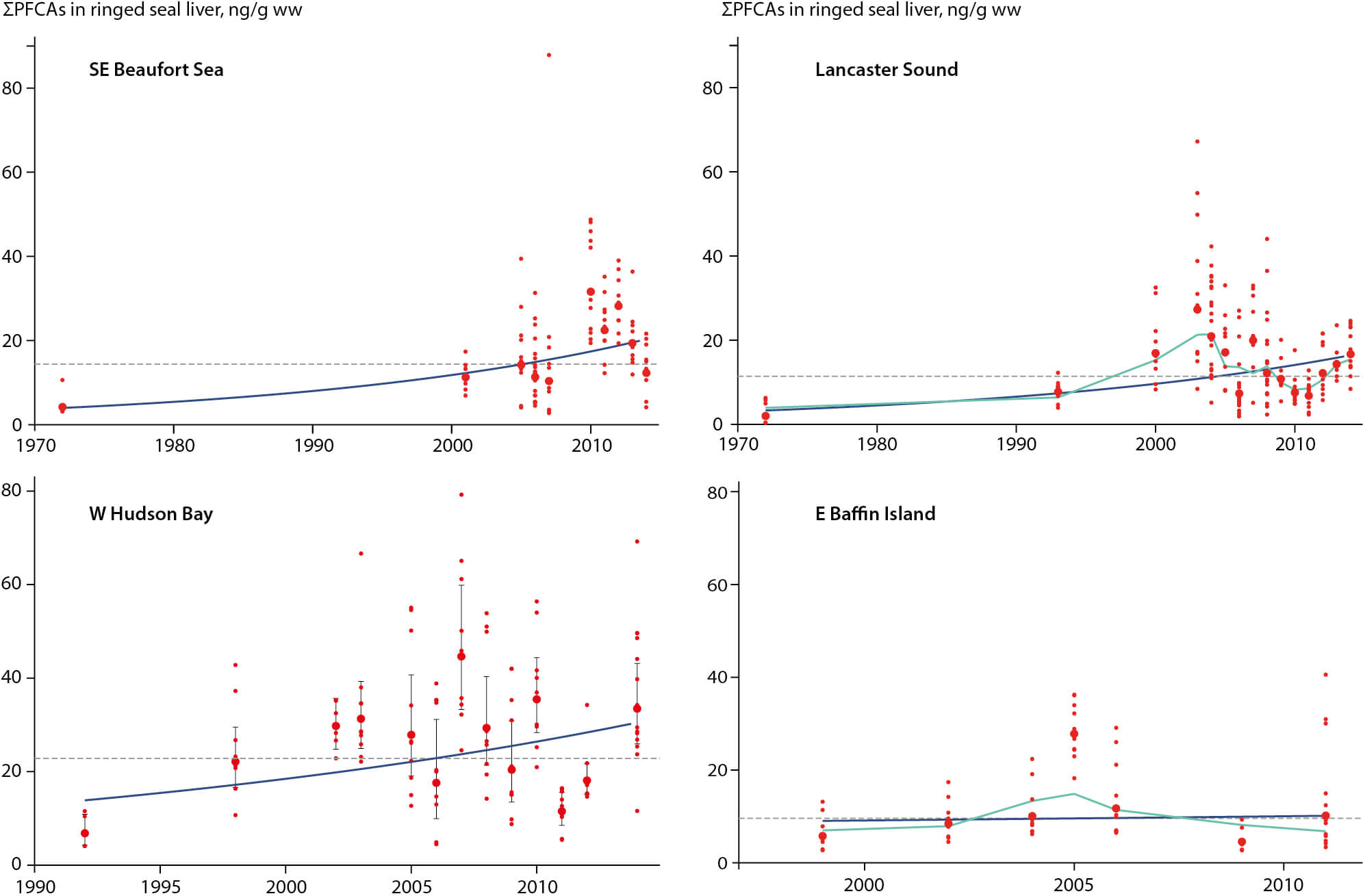 Figure 2.26 Temporal trends of total PFCAs (sum C7–C14-PFCAs) in ringed seal liver from four locations (SE Beaufort Sea= Sachs Harbour and Ulukhaktok; Lancaster Sound=Resolute, Grise Fiord and Arctic Bay; W. Hudson Bay = Arviat; E Baffin Is = Pangnirtung, Pond Inlet and Qikiqtarjuaq) in the Canadian Arctic (Muir et al., 2014). Blue lines represent trend; green lines represent 2-year moving average; larger red symbols and vertical lines are annual means and standard deviations.