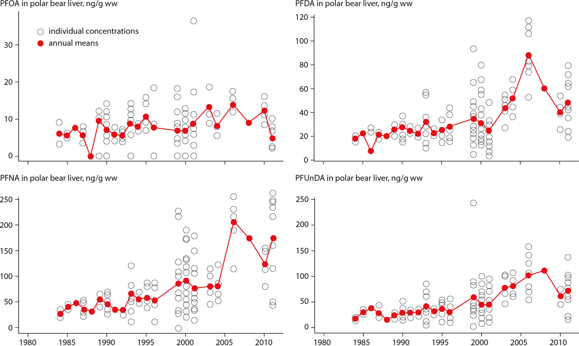 Figure 2.29 Temporal trends in PFOA, PFNA, PFDA, and PFUnDA in polar bear liver from Ittoqqortoormiit (East Greenland), after Rigét et al. (2013).