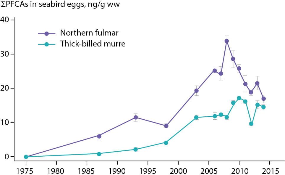 Figure 2.30 Mean (± SE) annual concentrations of total perfluorinated carboxylates (sum of C6–C14-PFCA) in eggs of northern fulmars and thick-billed murres from Prince Leopold Island, 1975–2014 (Braune, 2015).