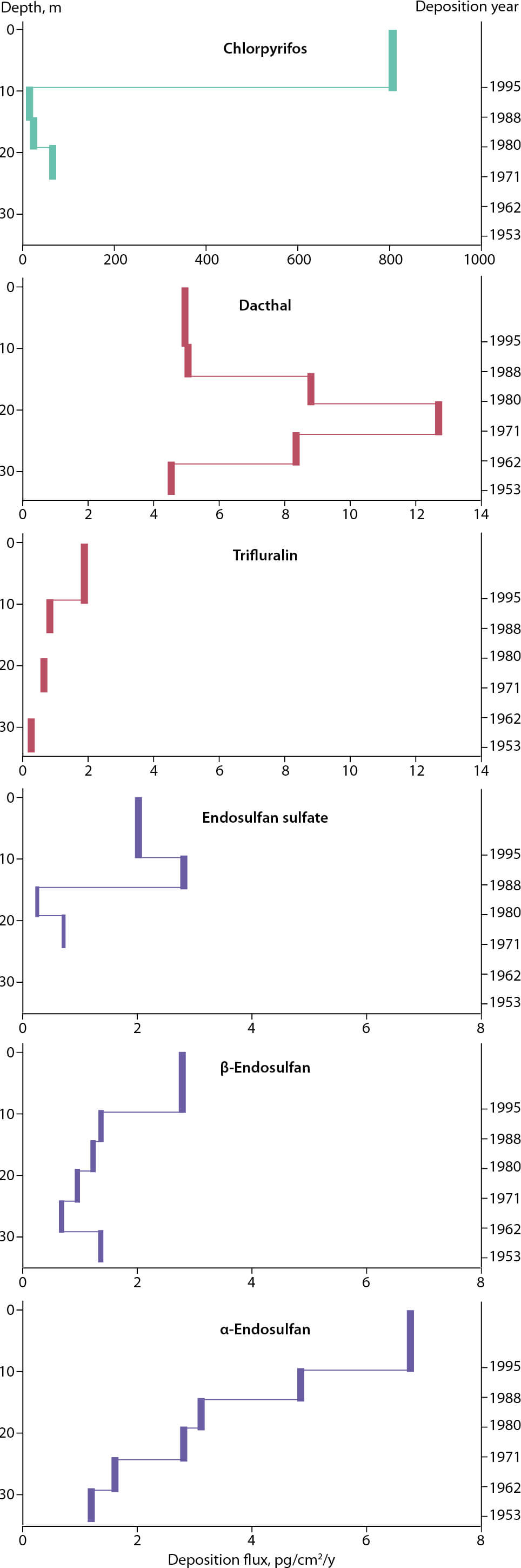 Figure 2.91 Trends in the deposition of current use pesticides in the Holtedahlfonna ice cap (Svalbard) (Ruggirello et al., 2010).