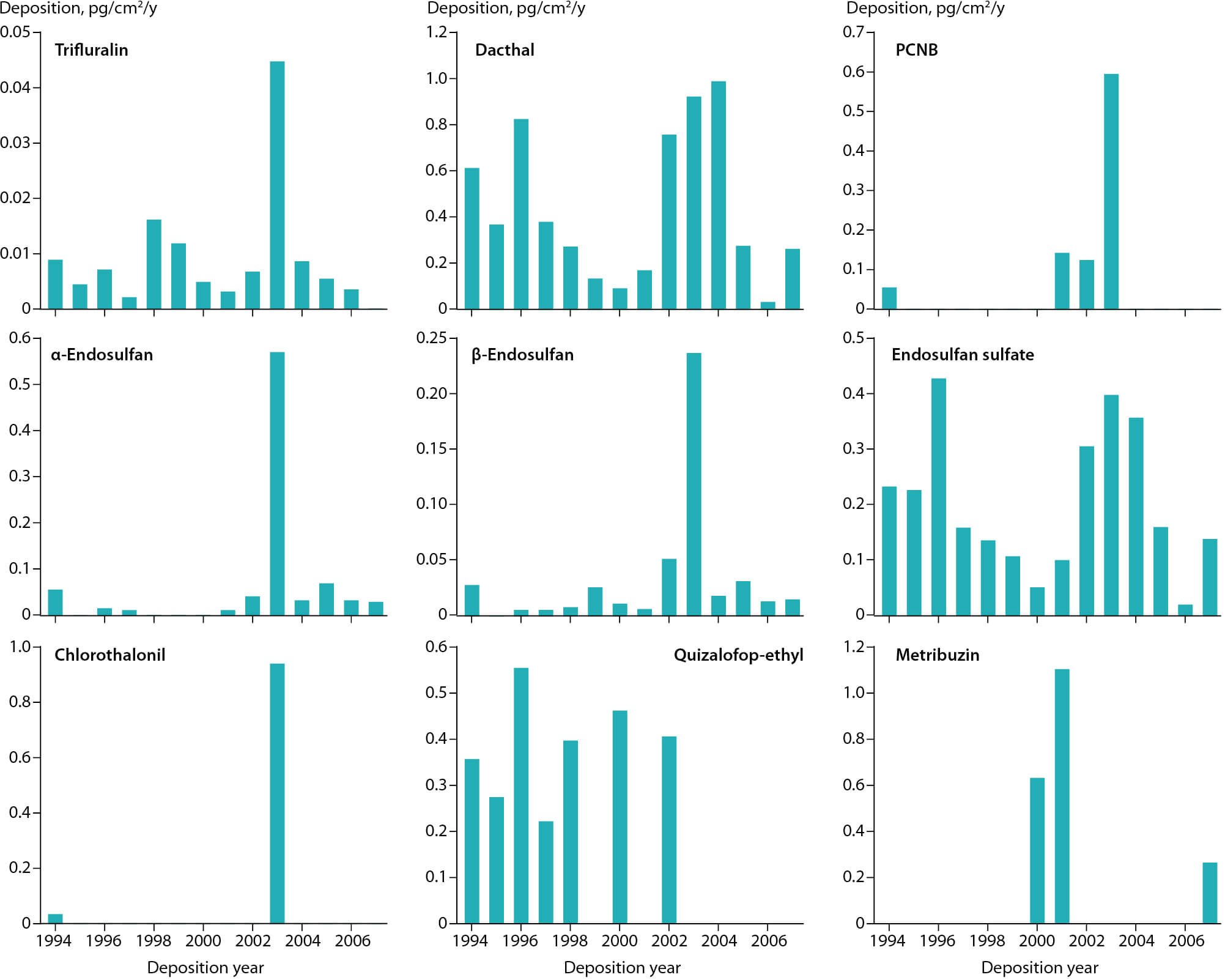 Figure 2.92 Annual net deposition fluxes of CUPs in snow segments from a snow pit dug on the Devon Island Ice Cap in 2008 (Zhang et al., 2013).