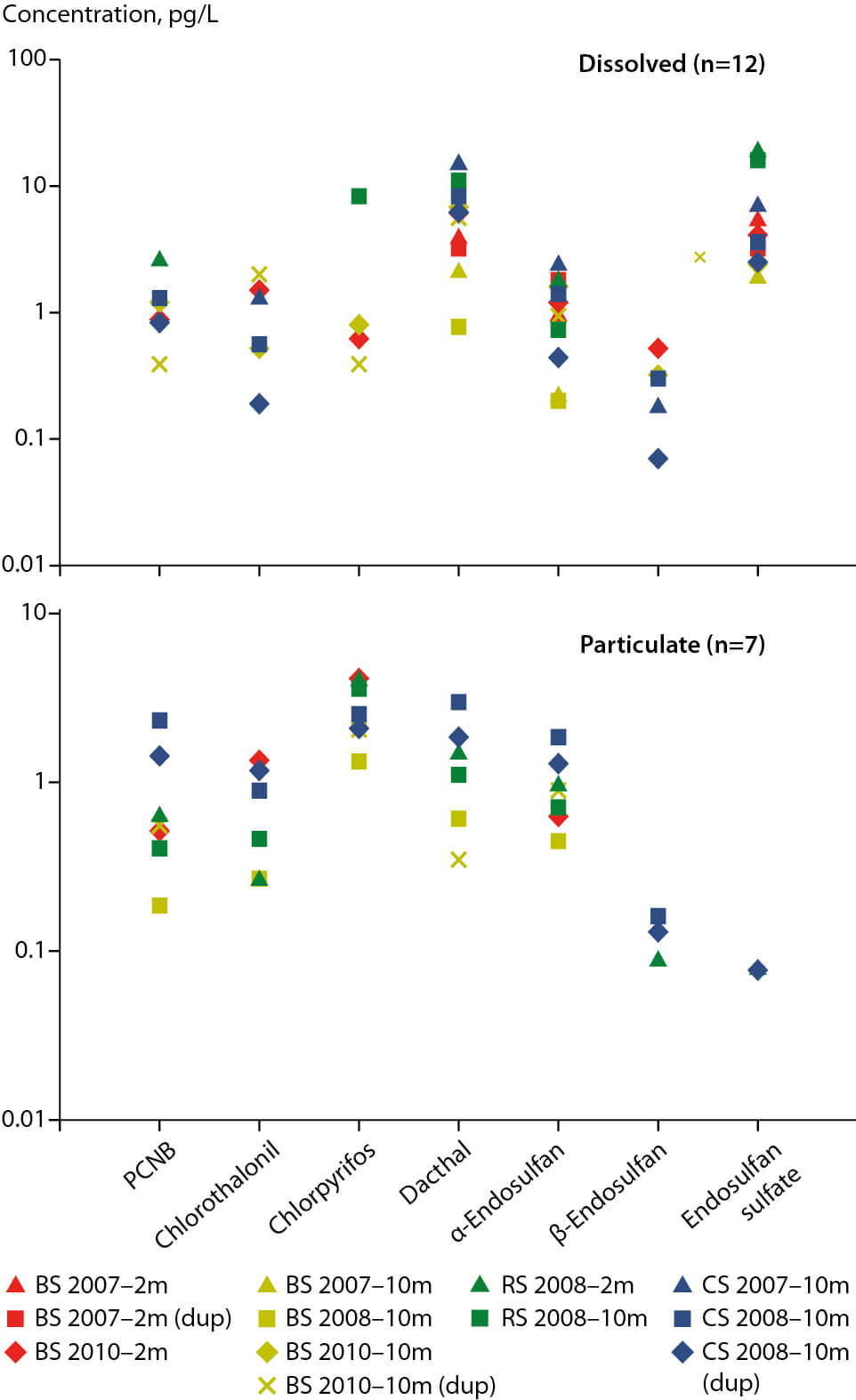 Figure 2.95 Concentrations of current-use pesticides in the unbound and dissolved phase and particulate phase of seawater collected from three Arctic locations between 2007 and 2010. Only concentrations above the method detection limit (MDL) are shown. Modified from Morris et al. (2016).