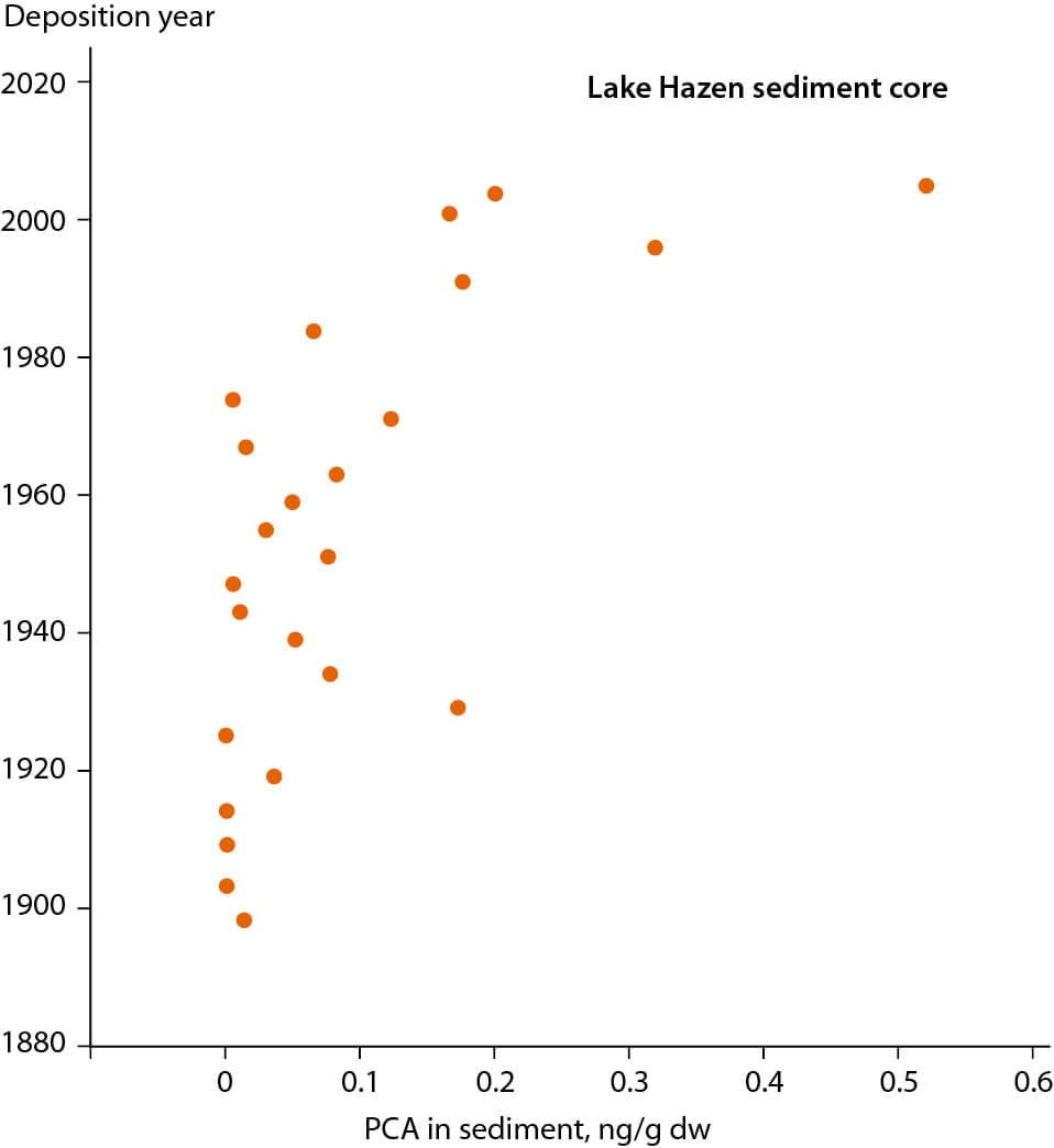 Figure 2.106 Concentrations of PCA in a sediment core from Lake Hazen, Nunavut, Canada (UNEP, 2013d).