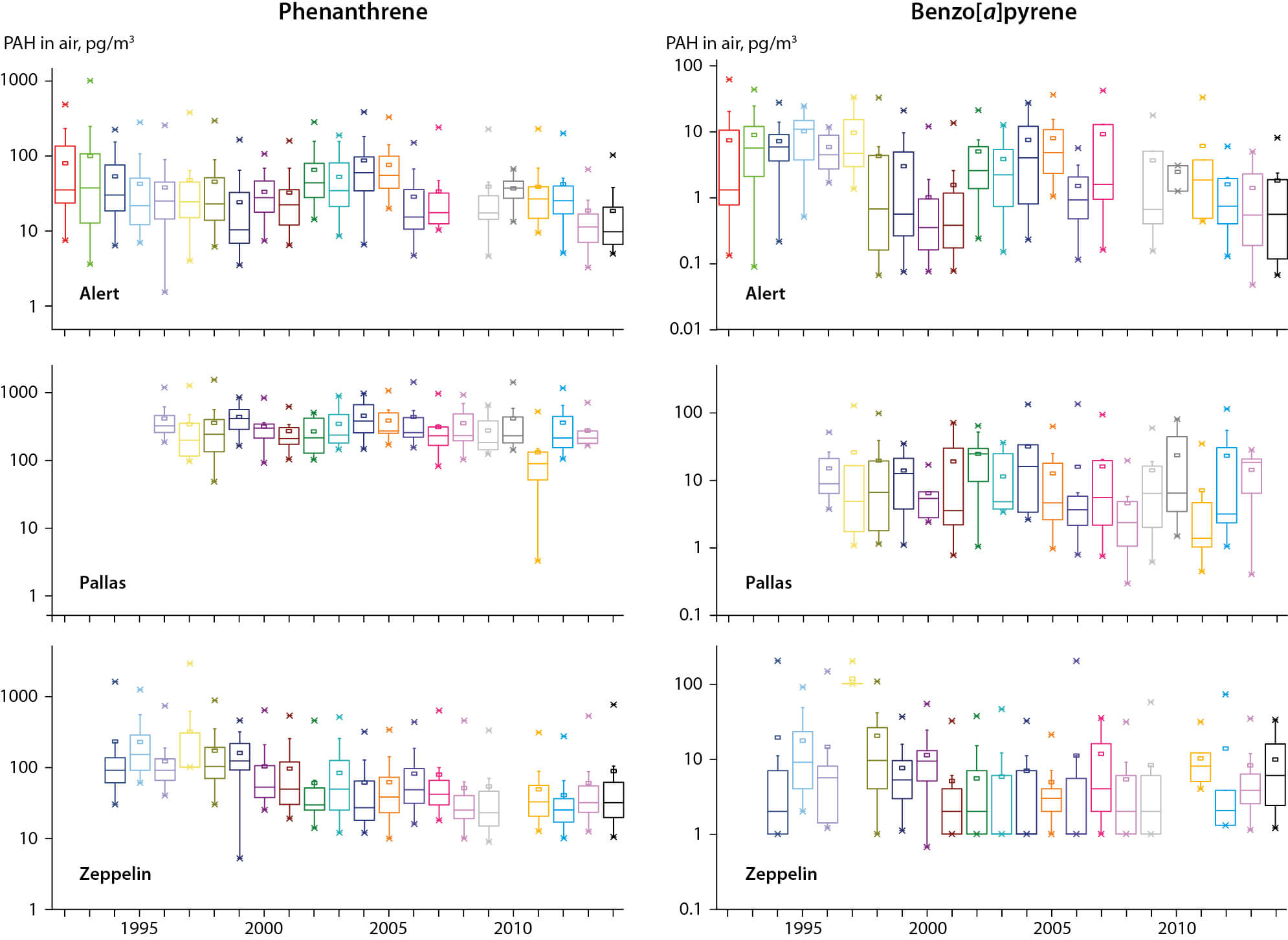 Figure 2.112 Time series of phenanthrene and benzo[a]pyrene observed in air at Alert, Pallas and Zeppelin. The boxes represent the 25th and 75th percentiles annually. The lines in the boxes and square symbols represent the annual median and annual mean, respectively. All outliers beyond the whiskers are shown individually. Yu et al. (in prep).