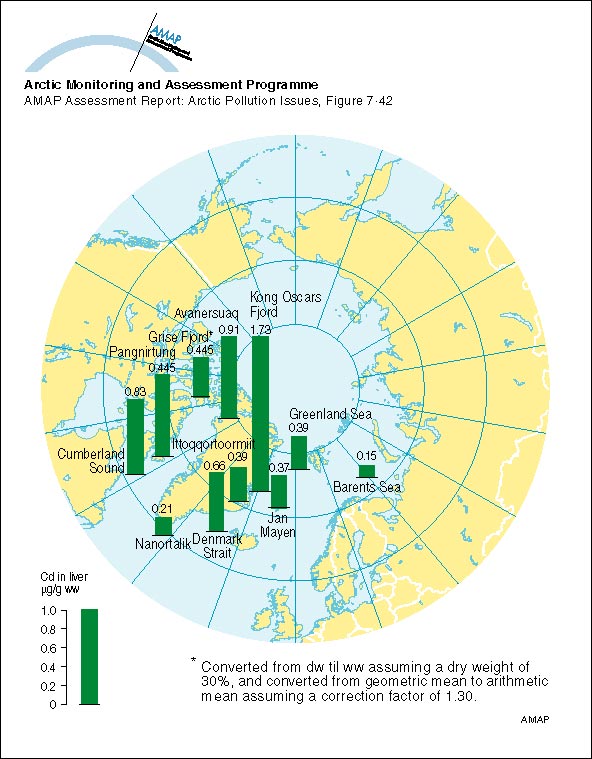 Circumpolar distribution of Cd levels in liver tissue of Arctic cod (Boreogadus saida) Arithmetic mean concentrations