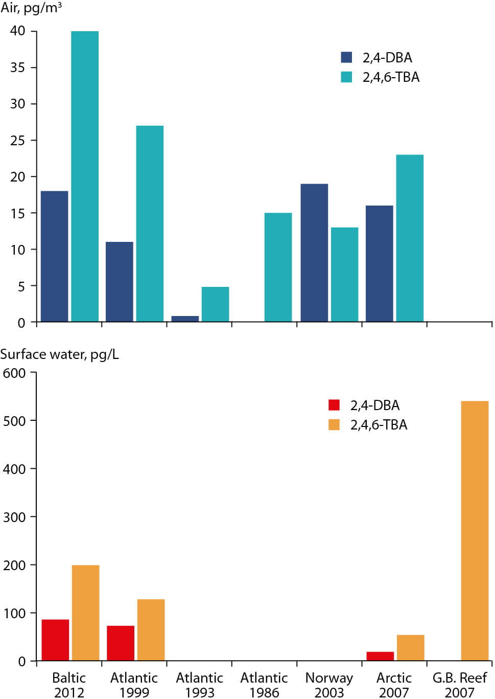 Figure 2.122 Bromoanisoles in ocean surface water and air. Data sources as follows: Baltic-2012 (Bidleman et al., 2014, 2015, 2016), Atlantic-1999 (Pfeifer and Ballschmiter, 2002), Atlantic-1993 (Führer and Ballschmiter, 1998), Atlantic-1986 (Wittlinger and Ballschmiter, 1990), Norway-2003 (Melcher et al., 2008), Arctic-2007 (Wong et al., 2011), Arctic-2007-2014 (Bohlin-Nizzetto et al., 2015), Great Barrier Reef-2007 (Vetter et al., 2009).