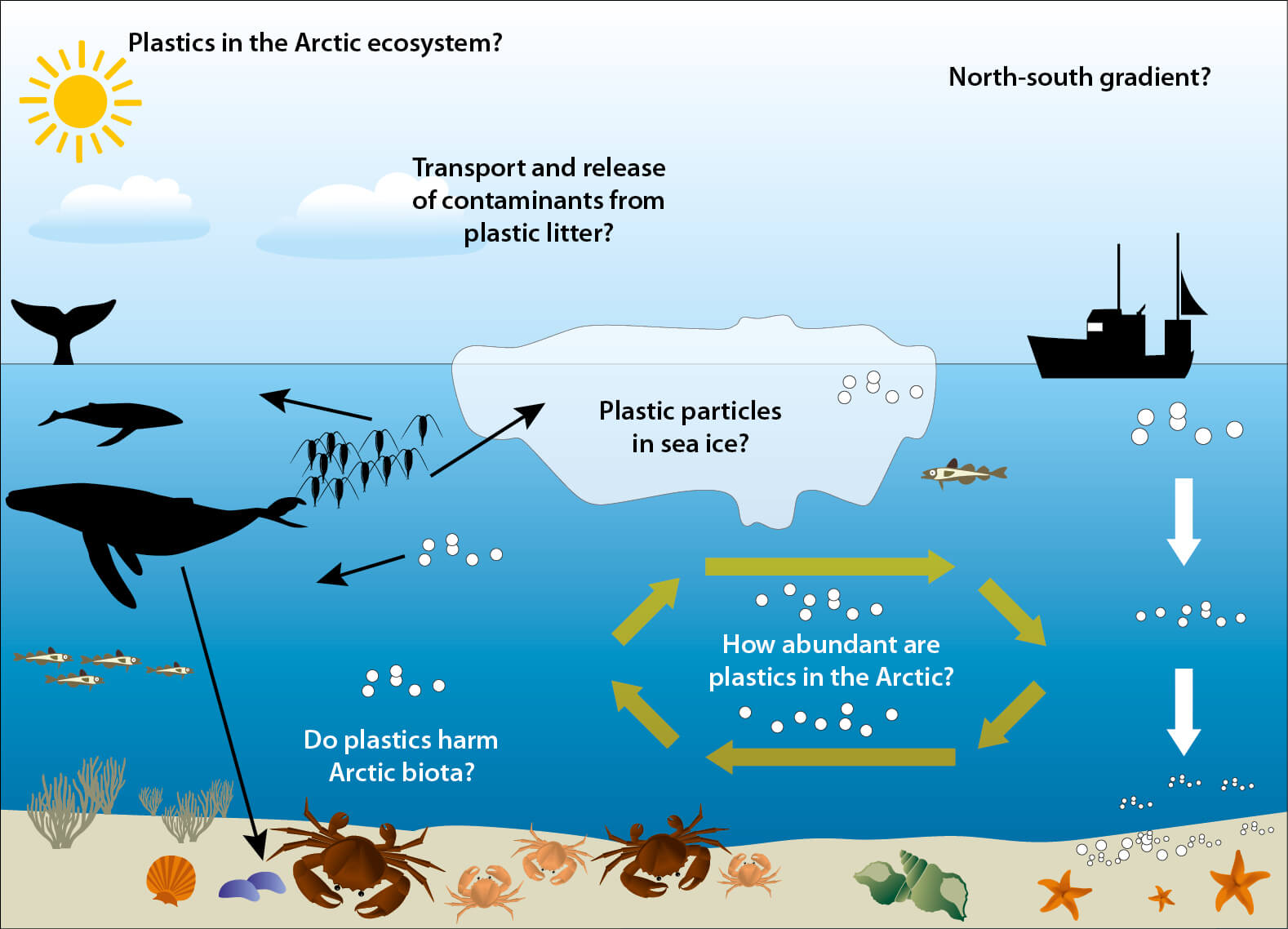Figure 2.125 Examples of knowledge gaps on the impact of plastic litter in the Arctic (Herzke and Bjørklid, NILU, Norway; Halsband Akvaplan-niva, Norway).