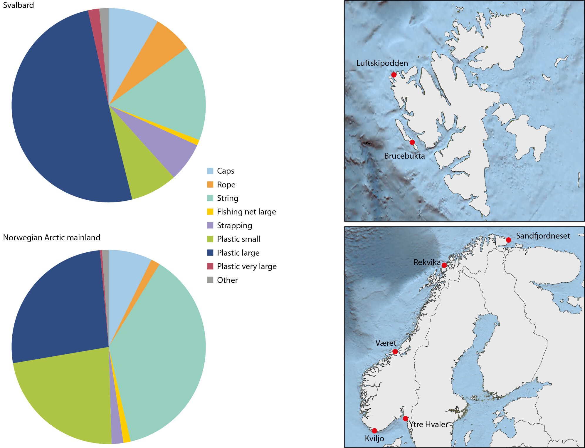Figure 2.126 Composition of main plastic items found on a 100-m section of beach located on Svalbard and the Norwegian Arctic mainland coast (OSPAR, 2009b), and locations of the beach monitoring sites.