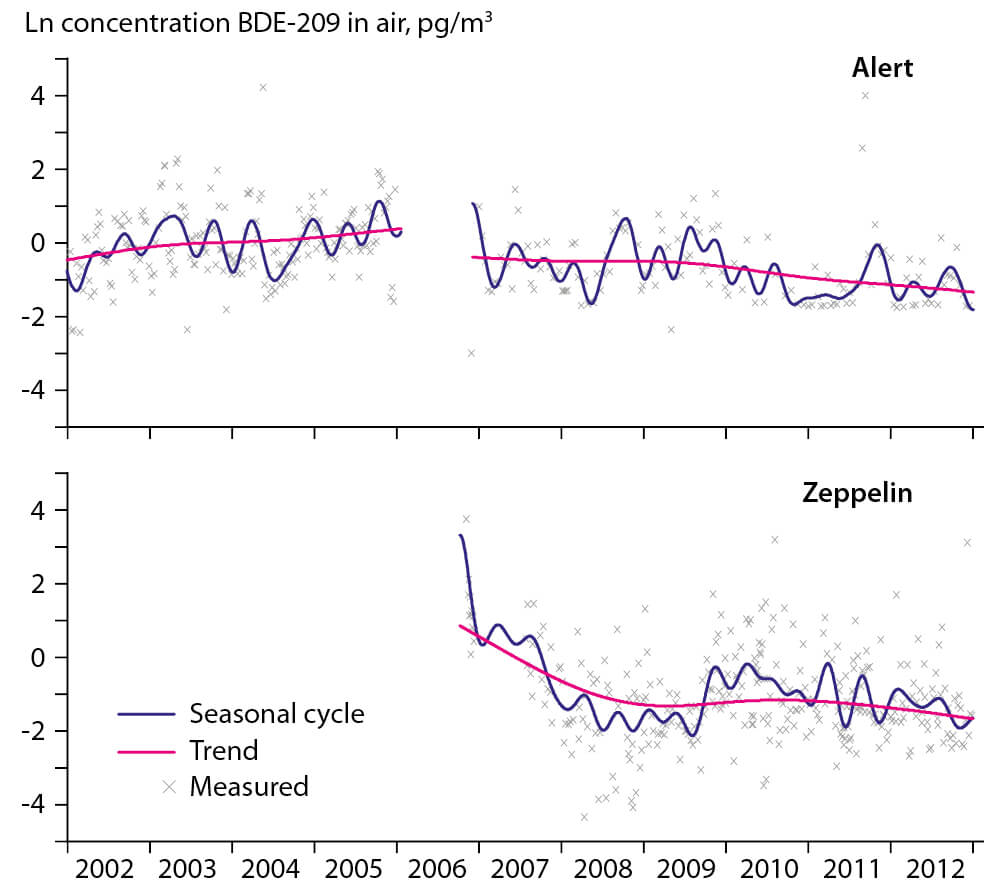 Figure 2.32 Temporal trends and seasonal cycles in BDE-209 concentrations in air at the monitoring stations at Alert (Canada) and Zeppelin (Svalbard, Norway) (Hung et al., 2013a).