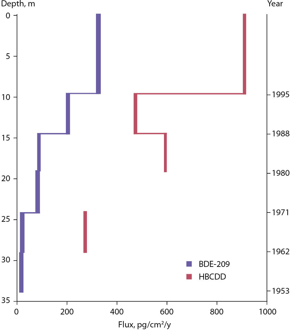 Figure 2.33 BDE-209 and HBCDD fluxes in Svalbard since the 1950s, as determined from ice core measurements (Hermanson et al., 2010).