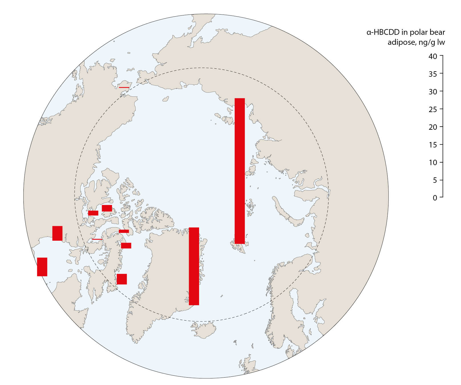 Figure 2.35 Geometric mean concentration of α-HBCDD in adipose of polar bears collected between 2005 and 2008 (data from McKinney et al., 2011b).
