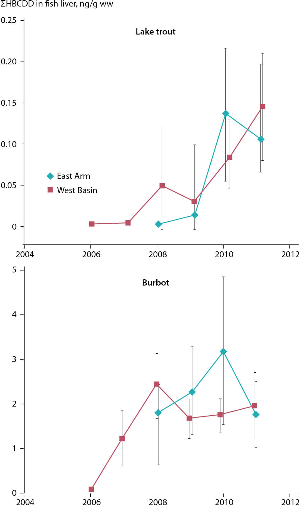 Figure 2.36 Concentration of ΣHBCDD in burbot and lake trout from Great Slave Lake (Yukon, Canada) (Muir et al., 2013b).