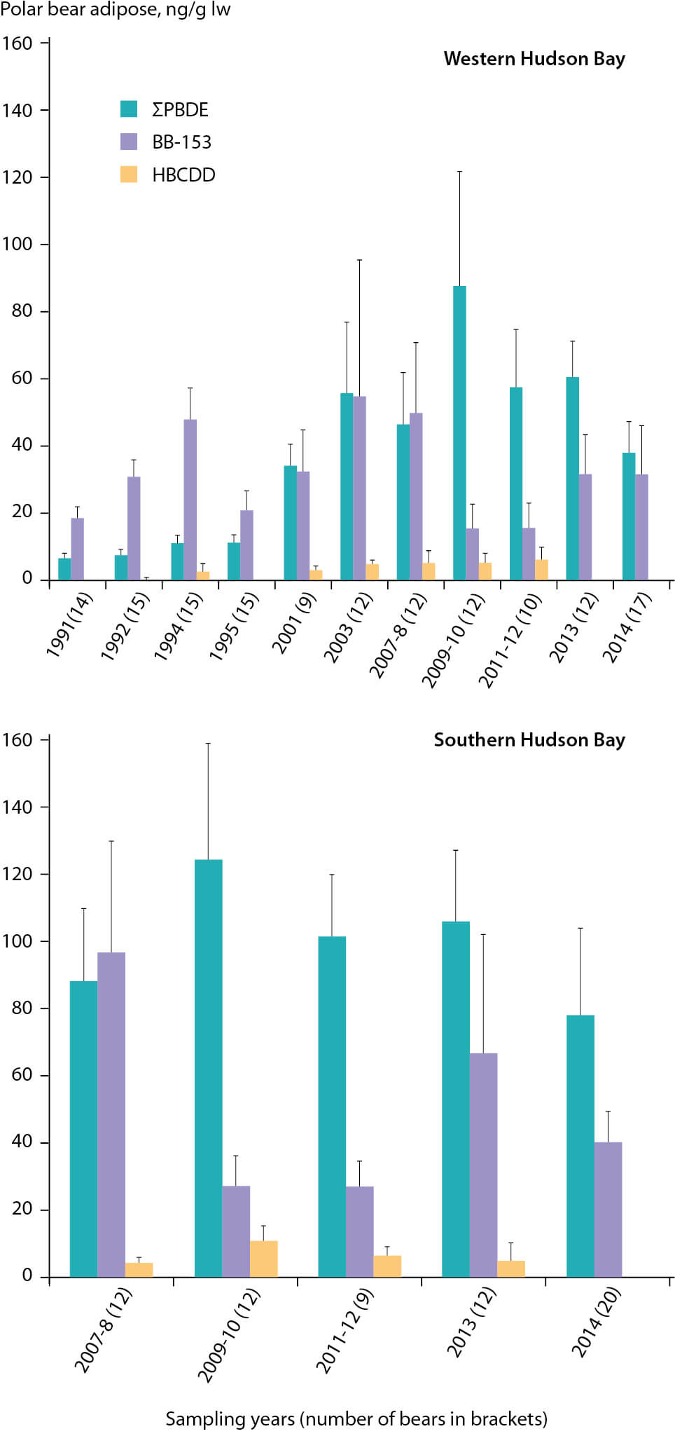Figure 2.38 Temporal trends in geometric mean concentrations of PBDEs, ΣHBCDD and BB-153 in western Hudson Bay polar bears (upper panel, 1991–2007: McKinney et al., 2010; 2008–2014: NCP, 2015a) and southern Hudson Bay polar bears (lower panel, 2008–2014: NCP, 2015a). Error bars are standard deviations. Data not corrected for sex, age or diet. The absence of ΣHBCDD in the graphic indicates concentrations below detection limits.