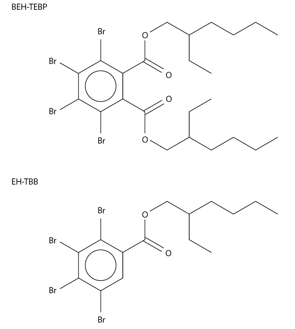 Figure 2.41 Chemical structures of bis(2-ethylhexyl)tetrabromophthalate (BEH-TEBP) and 2-ethylhexyl-2,3,4,5-tetrabromobenzoate (EH-TBB).
