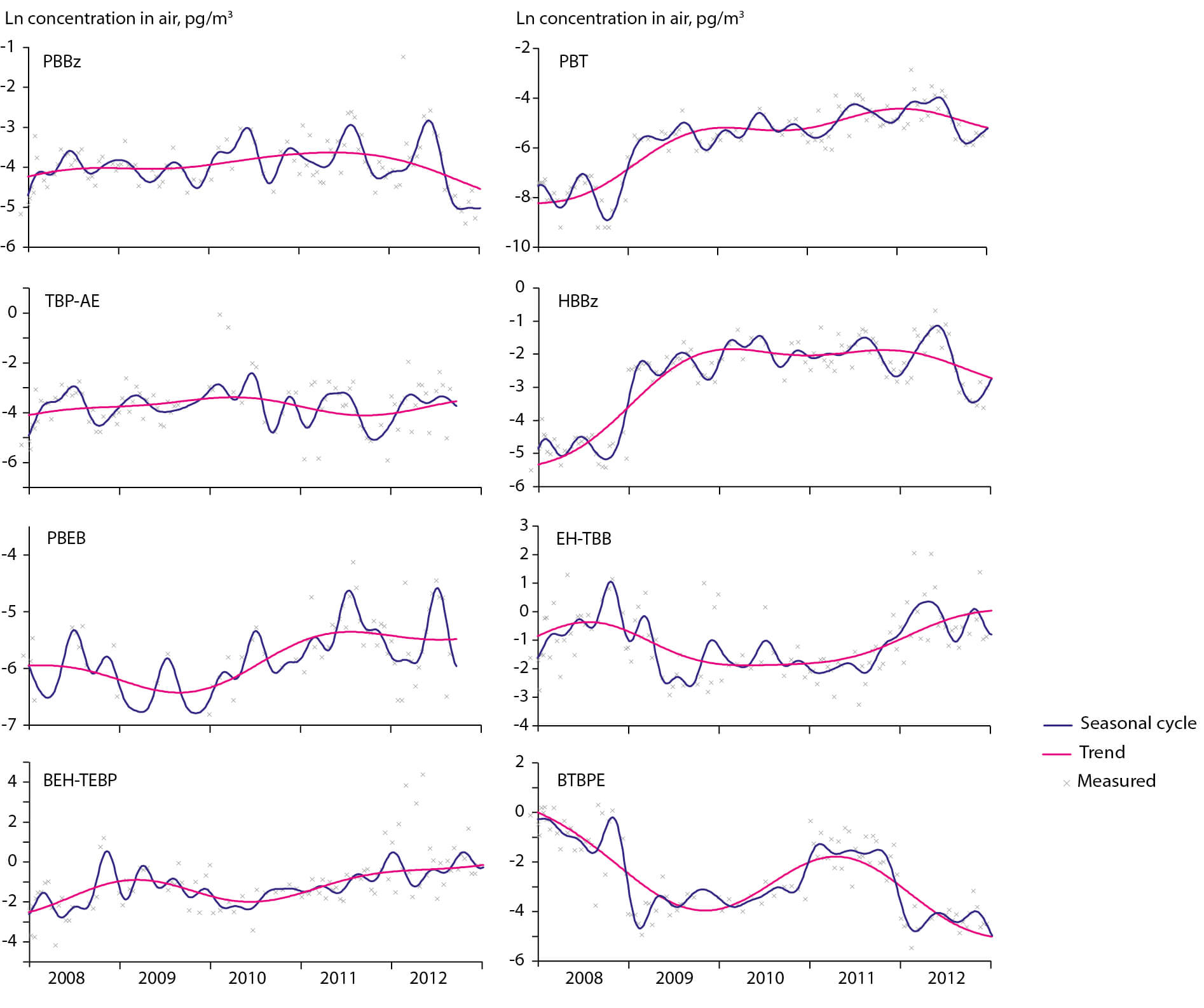 Figure 2.43 Novel brominated flame retardants in air at Alert (concentration below detection limits are not displayed).