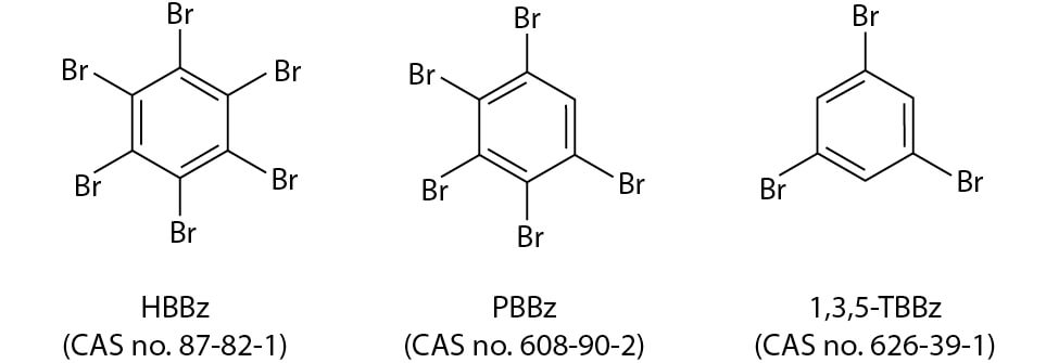 Figure 2.49 Chemical structures of hexabromobenzene (HBBz), pentabromobenzene (PBBz) and 1,3,5-tribromobenzene (1,3,5-TBBz).