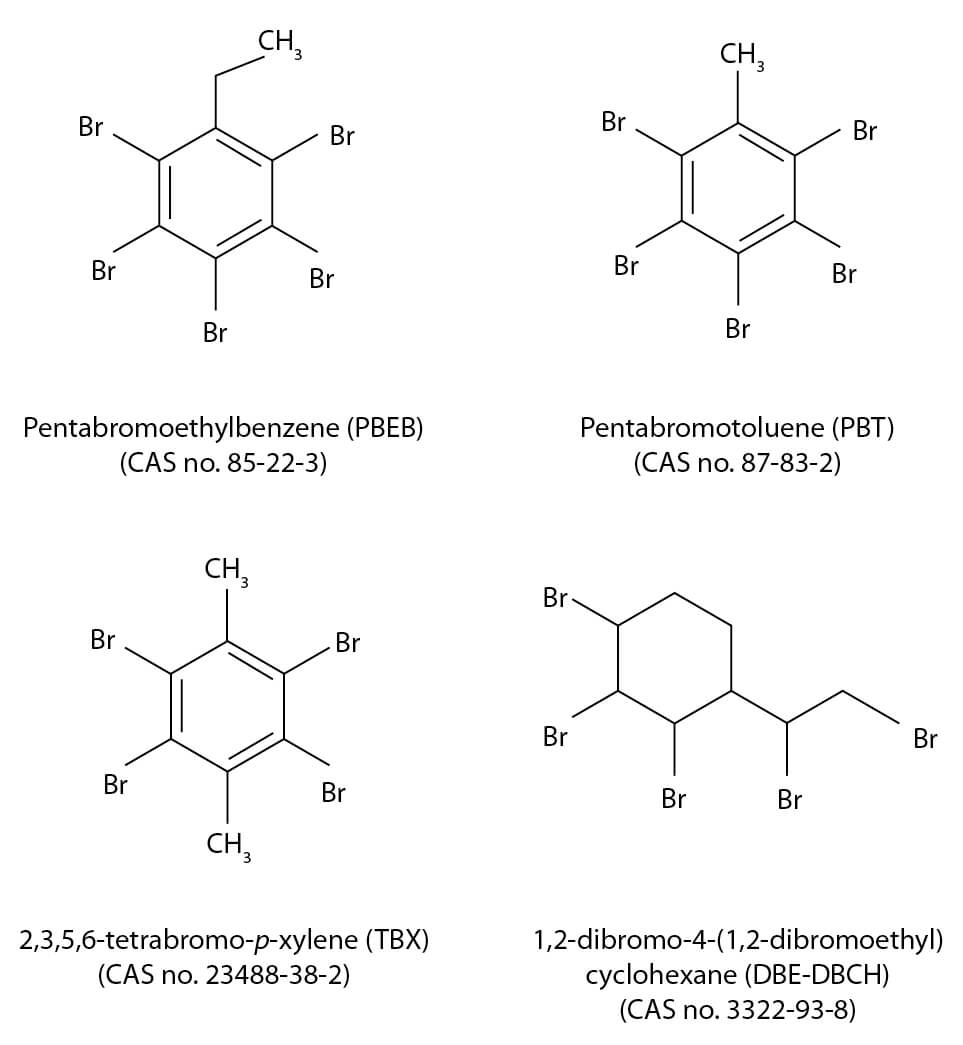 Figure 2.51 Chemical structures and CAS numbers of pentabromoethylbenzene (PBEB), pentabromotoluene (PBT), 2,3,5,6-tetrabromo-p-xylene (TBX) and 1,2-dibromo-4-(1,2-dibromoethyl)cyclohexane (DBE-DBCH).