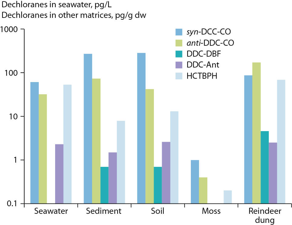 Figure 2.57 Mean concentrations of dechloranes measured in various terrestrial matrices from Ny-Ålesund, Svalbard (based on Na et al., 2015).