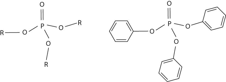 Figure 2.58 Generic chemical structure (left figure) of organophosphate triester flame retardants (also referred to as phosphate flame retardants; PFRs), where the R-substituents can be one of many alkyl groups, which may also be aryl and/or halogenated. On the right is a representative PFR, namely triphenyl phosphate (TPHP). Hydrogen atoms have been omitted for clarity.