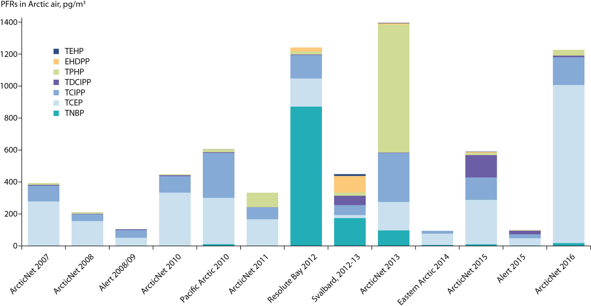 Figure 2.59 Average concentrations of PFRs in Arctic air for the period 2007–2016. Canadian Arctic: ArcticNet 2007 (shipboard August in the Labrador Sea and Hudson Bay areas), ArcticNet 2008 (shipboard Beaufort Sea in May-June), ArcticNet 2010 (central and eastern Canadian Archipelago, August), ArcticNet 2011 (shipboard central and east archipelago), ArcticNet 2013 (shipboard in Barrow Strait and McClure Strait), ArcticNet 2015 (central and eastern Canadian Archipelago, August), ArcticNet 2016 (central and eastern Canadian Archipelago, August). Alert 2008/09: land-based December 2008 to August 2009 (blank problems for TPHP), Alert 2015 (land-based, summer). Pacific Arctic 2010: ship-based Bering-Chukchi-Beaufort Seas summer 2010. Svalbard (Longyearbyen) 2012-2013. Eastern Arctic, 2014. Data sources: ArcticNet 2007, ArcticNet 2008, ArcticNet 2010, ArcticNet 2011, ArcticNet 2013 (Sühring et al., 2016a); ArcticNet 2015, ArcticNet 2016 (Jantunen pers. comm.); Pacific Arctic 2010 (Möller et al., 2012); Resolute Bay 2012 (Sühring et al., 2016a); Svalbard, 2012-13 (Salamova et al., 2014); Eastern Arctic 2014 (Li et al., 2017 EST).