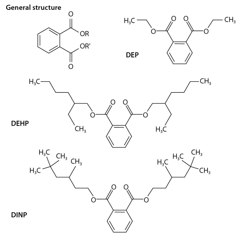 Figure 2.60 General structure of phthalate esters together with some examples: DEP, DEHP and DINP.