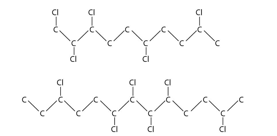 Figure 2.63 Structure of two SCCPs (C10H17Cl5 and C13H22Cl6) (UNEP, 2015b).
