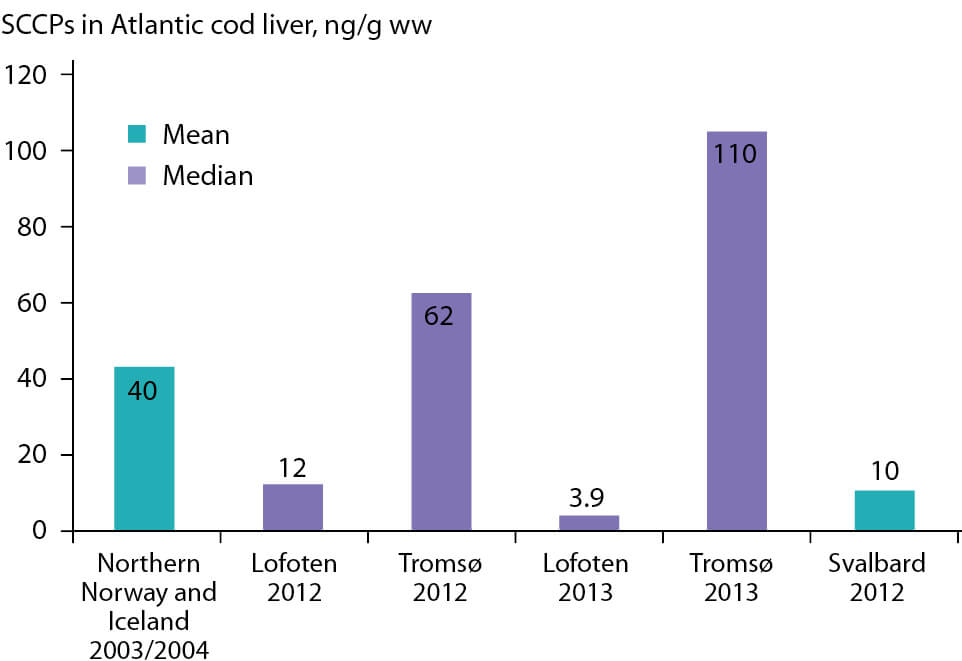 Figure 2.68 Concentrations of SCCP in Atlantic cod from the Arctic. The numbers in or above the bars are measured concentrations. Data sources: northern Norway and Iceland 2003/2004 (Reth et al., 2006), Lofoten 2012 and Tromsø 2012 (NIVA, 2013), Lofoten 2013 and Tromsø 2013 (NIVA, 2014), and Svalbard 2012 (NILU, 2013).