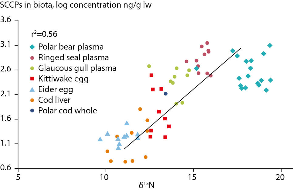 Figure 2.70 Relationship between SCCP concentrations and isotopic nitrogen signature (NILU, 2013).