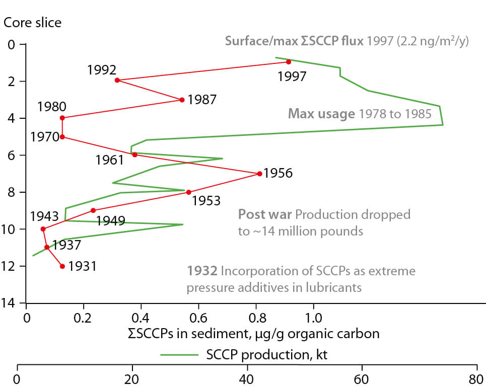 Figure 2.71 Profile of SCCP concentrations in a dated sediment core from Lake DV09 on Devon Island, Nunavut, Canada (Stern and Evans, 2003).