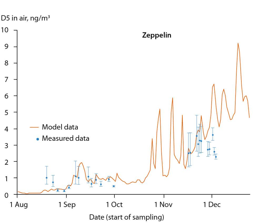 Figure 2.75 Measured and modelled (Danish Eulerian Hemispheric Model, DEHM) concentrations for D5 at Zeppelin (Svalbard, Norway) in 2011 (based on Krogseth et al., 2013a).