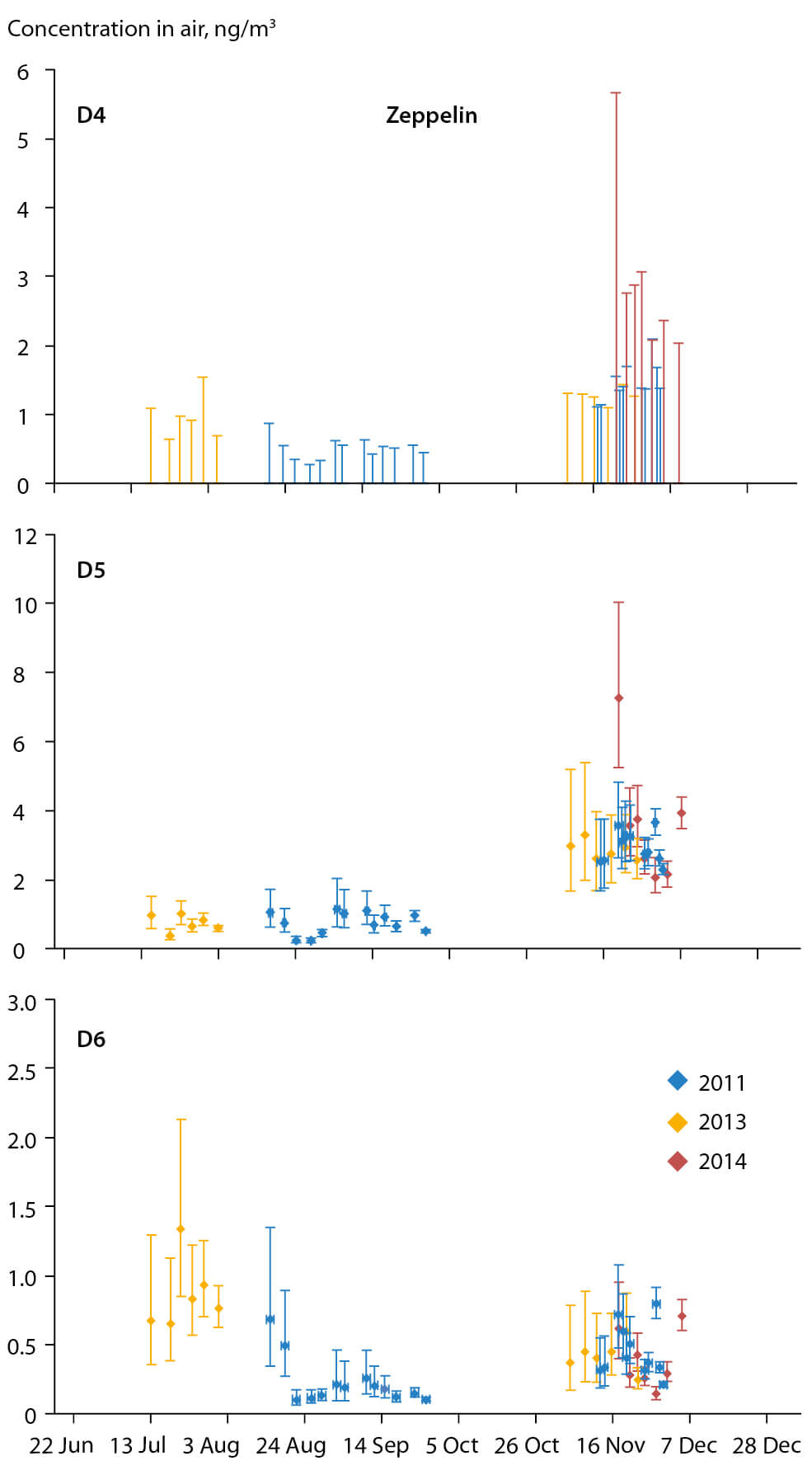 Figure 2.76 Measured concentrations of D4, D5 and D6 at Zeppelin station in 2011 (Krogseth et al., 2013a), 2013 and 2014. Concentrations of D4 are reported as a range from non-detected to the upper limited detected. Concentrations reported for D5 and D6 are storage-corrected with a range representing the 95% confidence interval of the storage correction. Figure from Bohlin-Nizzetto et al. (2015).