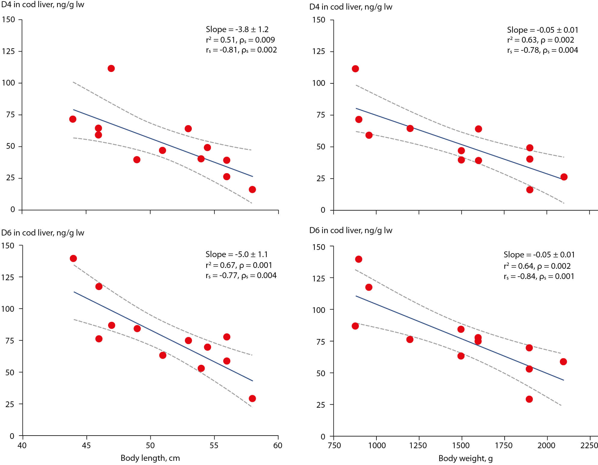 Figure 2.78 Linear regressions and Spearman correlations between D4 and D6 liver concentrations and fish length and weight for Atlantic cod collected from Tromsø. Dashed line represents 95% confidence interval of linear regression; r2 and rs represent correlation coefficient for linear and Spearman regression tests, respectively; ρ and ρs represent probability for linear and Spearman correlation to be caused by random sampling, respectively (Warner et al., 2014).